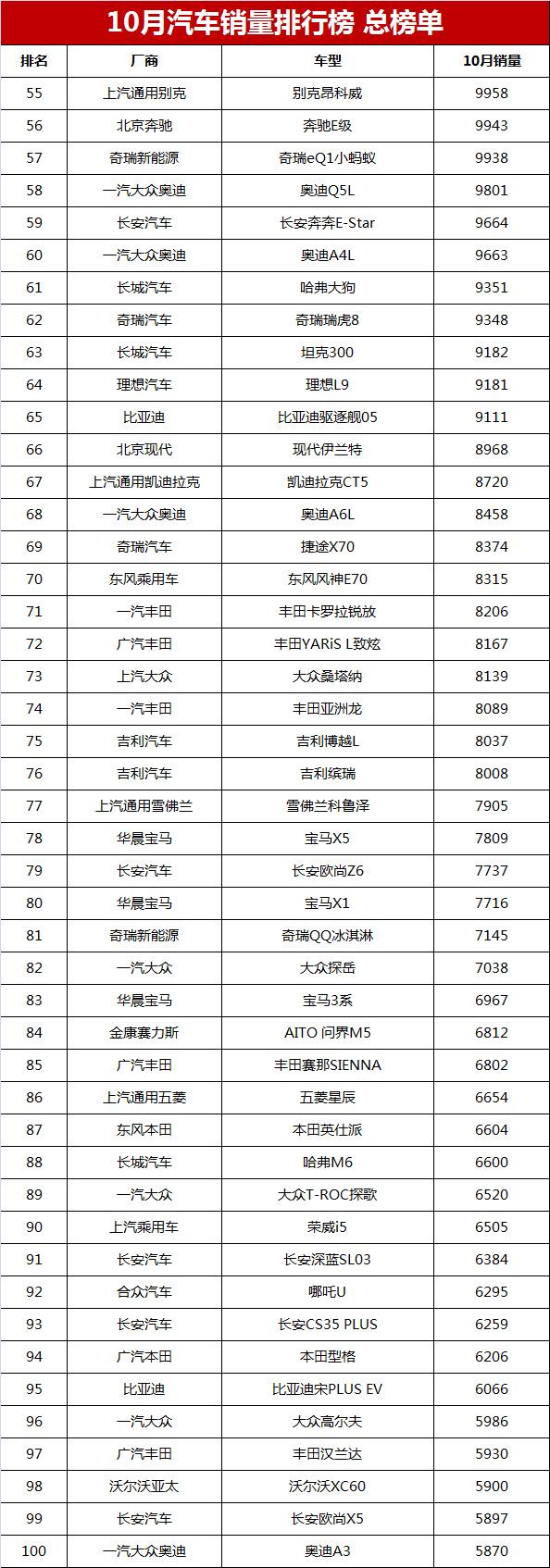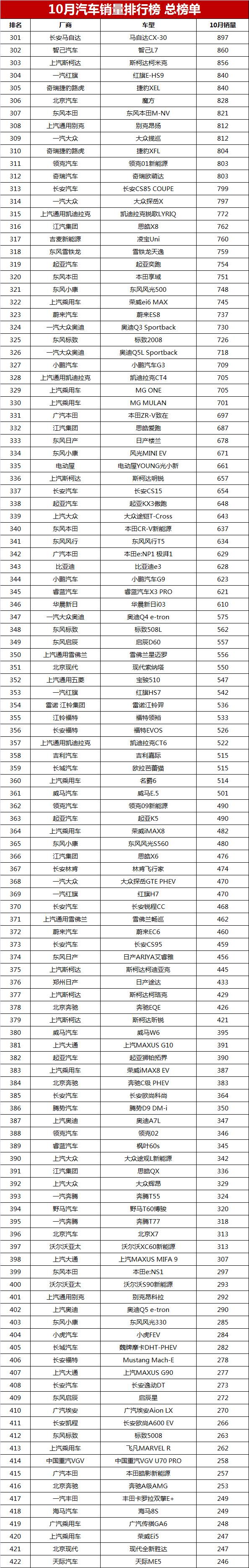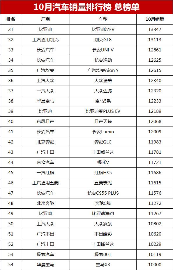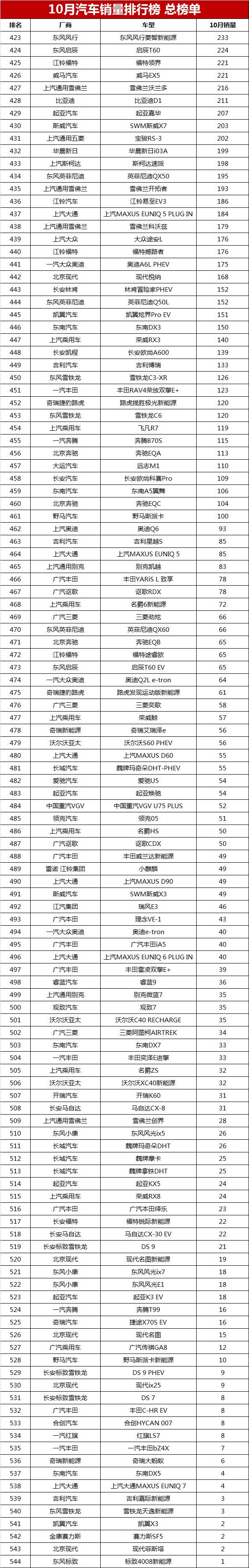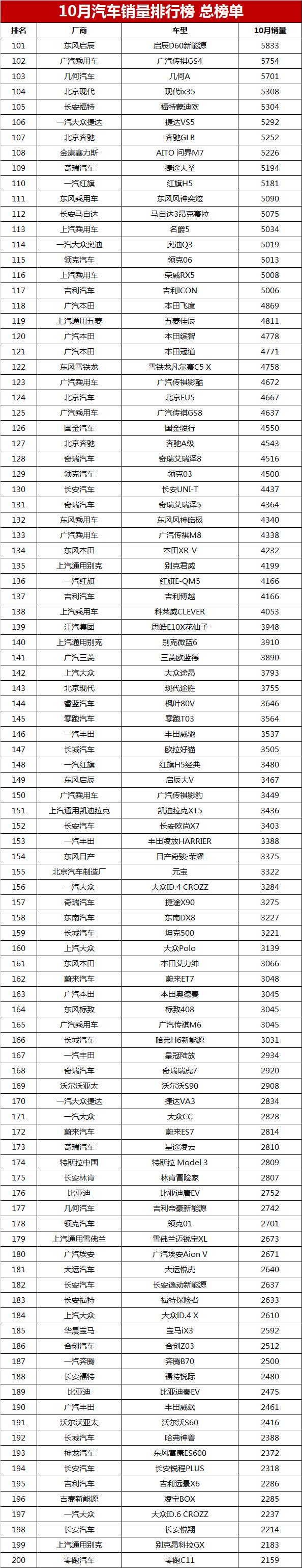 127 次2025年10月燃油車汽車銷量排行榜完整版名單(批發量