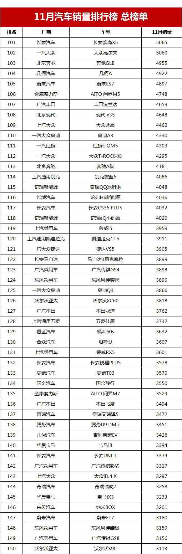 143 次2021年11月轎車銷量排行榜完整版名單