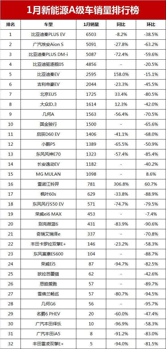 185 次2020年1月新能源緊湊型車銷量排行榜完整版名單